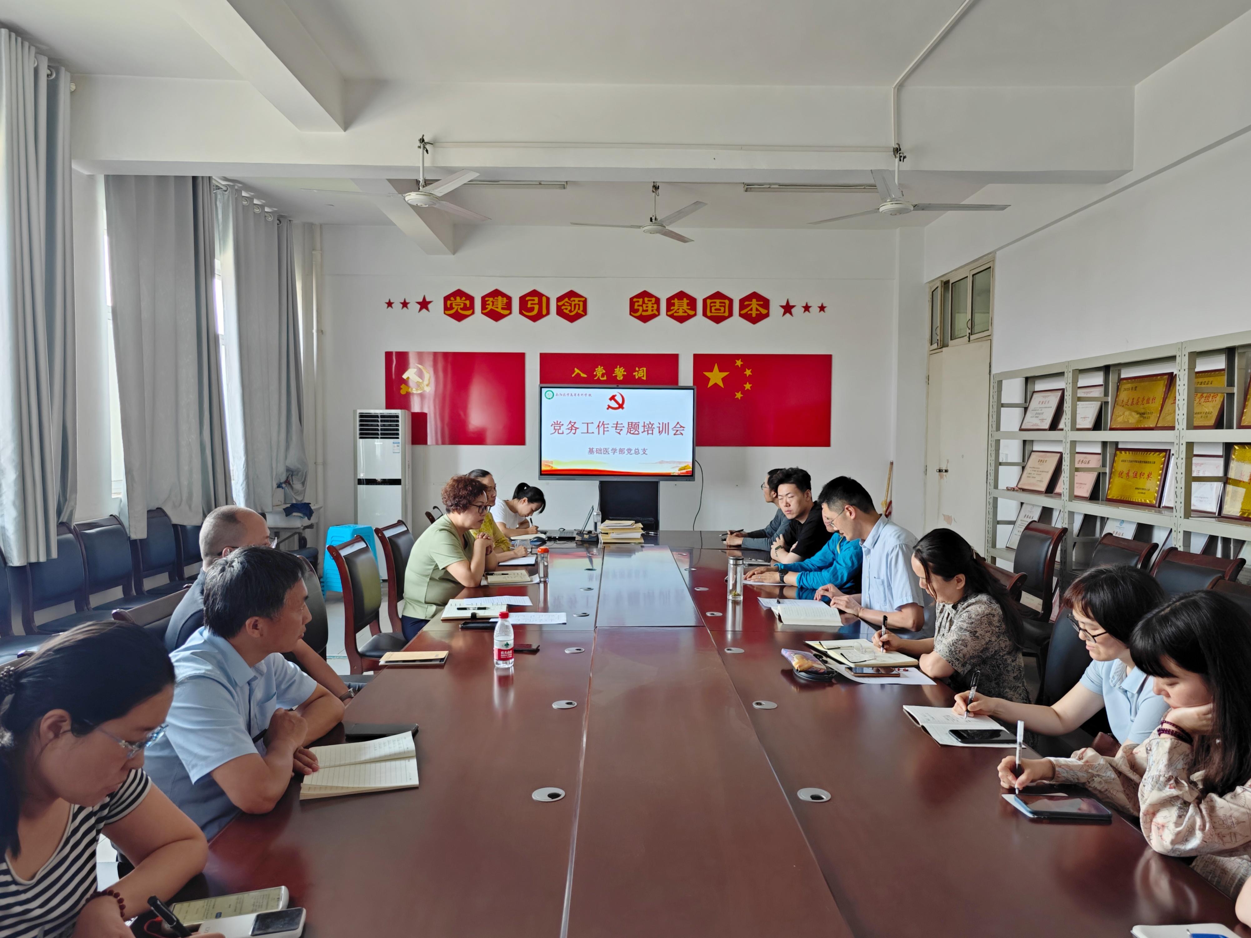 5月28日,基础医学部党总支在6108会议室召开党务工作专题培训会。党总支书记陈铁良,党总支副书记、主任马瑜红,党总支委员及各党支部委员、党小组组长参加会议。